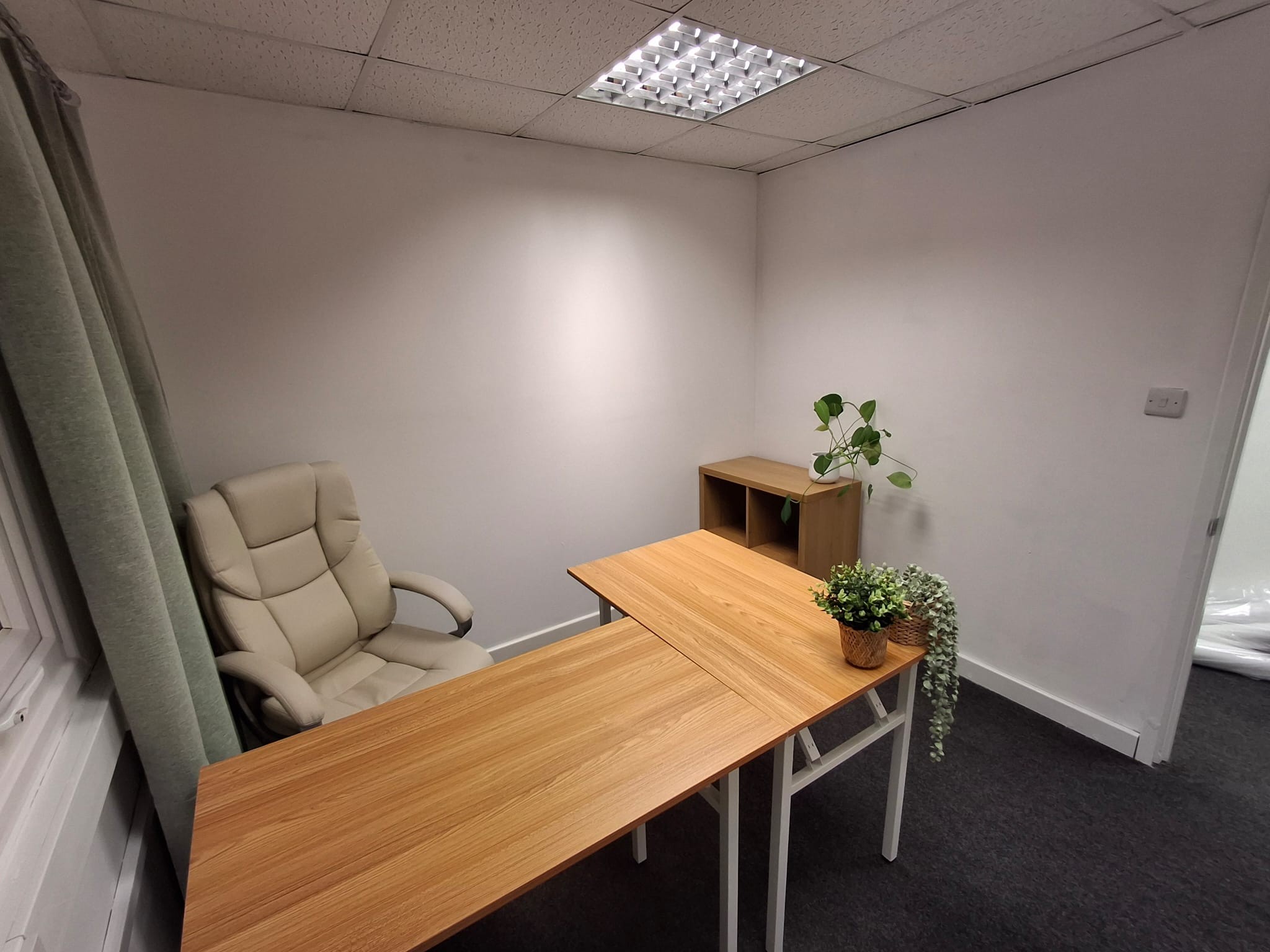 A bright, blank-canvas room available to rent, suitable for a range of uses. Ideally suited as a therapy or treatment room, complementing the massage and treatments currently offered in the rest of the premises, though it would also work well as a quiet office space.
