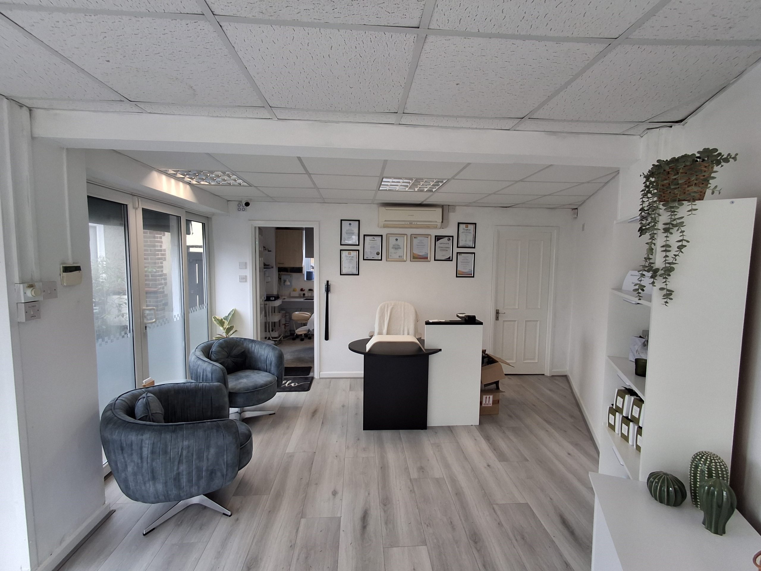 The room benefits from access to a shared WC and kitchenette, a pleasant unmanned reception/waiting area, and customer parking.