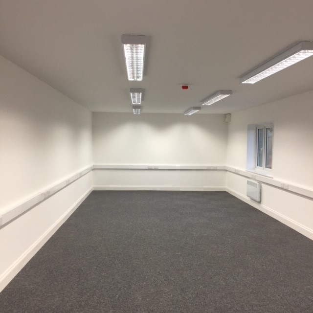 Approx. 558 sq ft first-floor office to let with kitchenette, personnel door and carpeted flooring. The unit is well lit with power sockets on all four walls. Broadband services available by separate negotiation