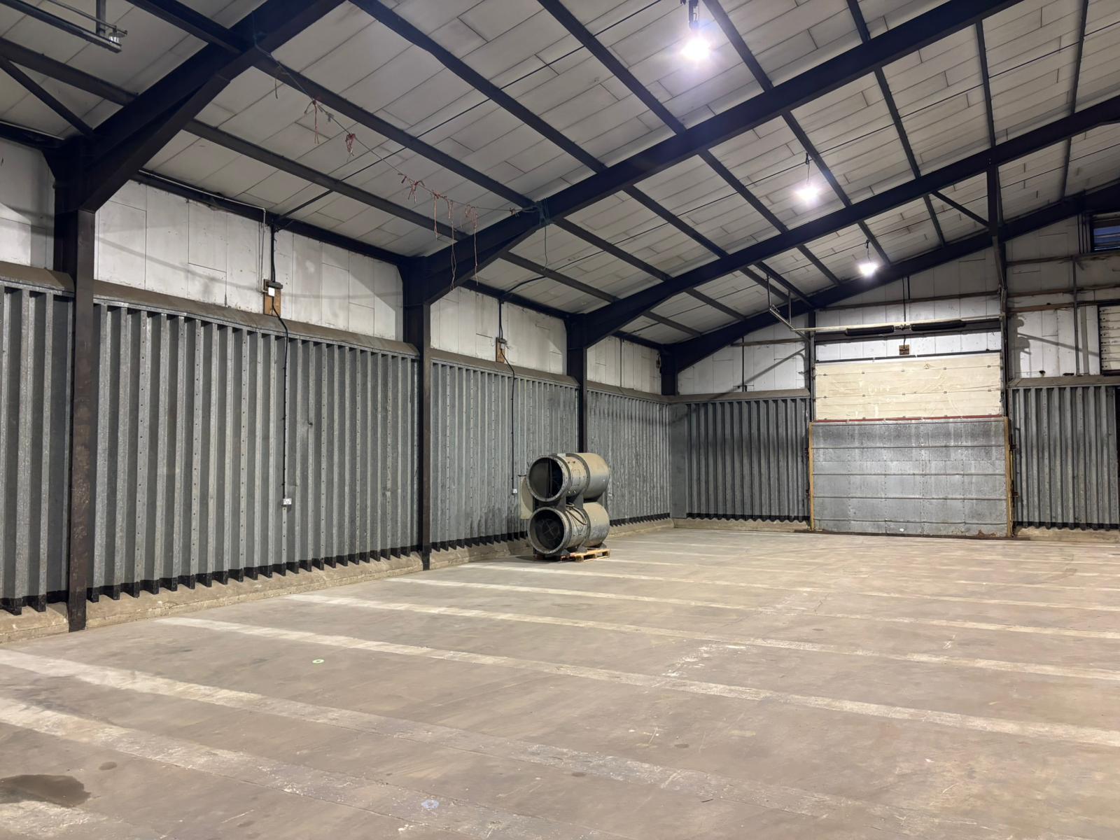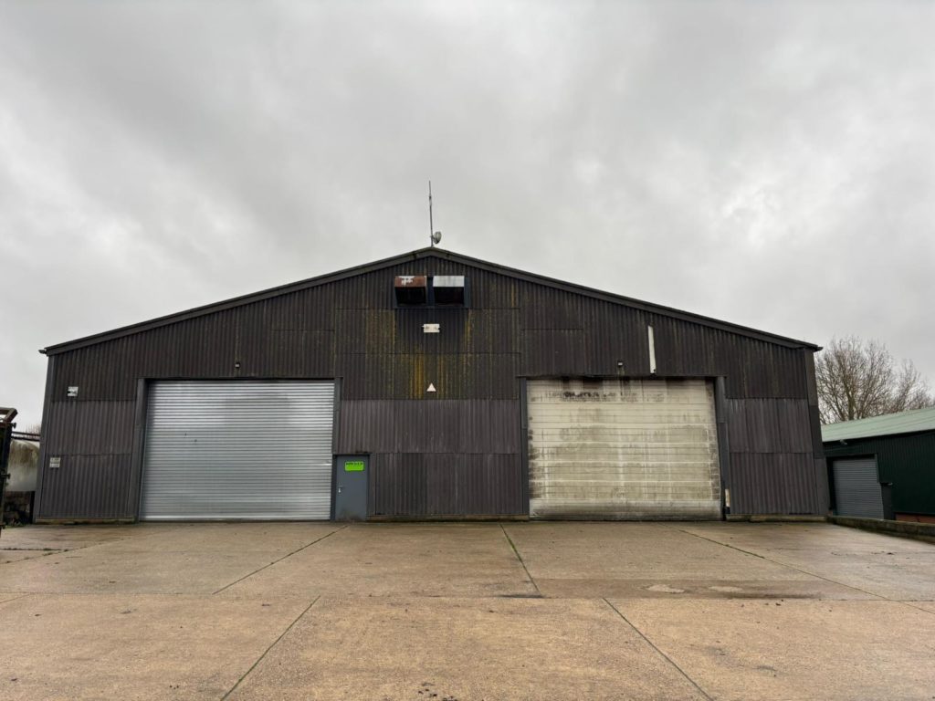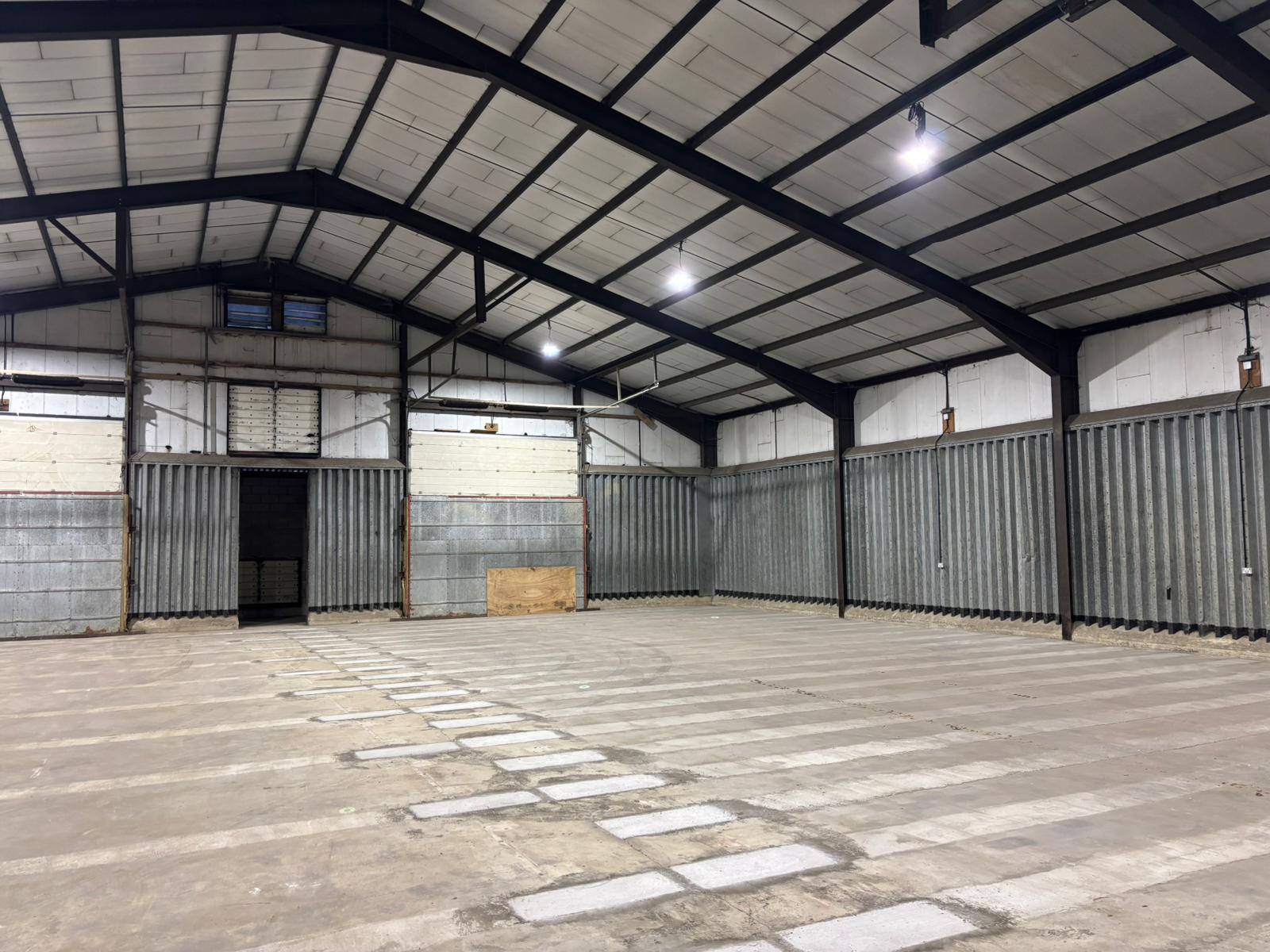 6,400 sq ft warehouse to let in a rural site with electric roller-shutter doors and a concrete floor.