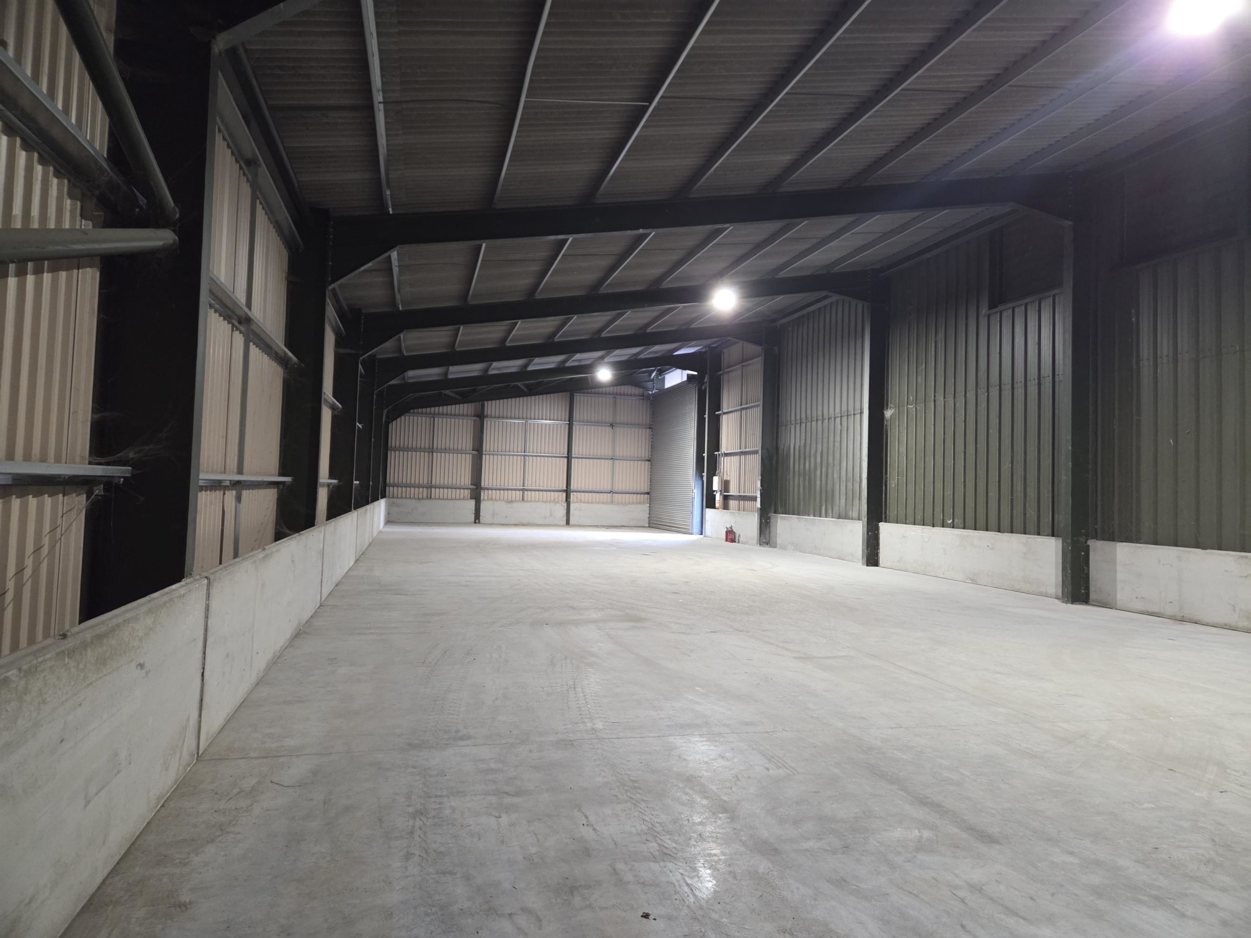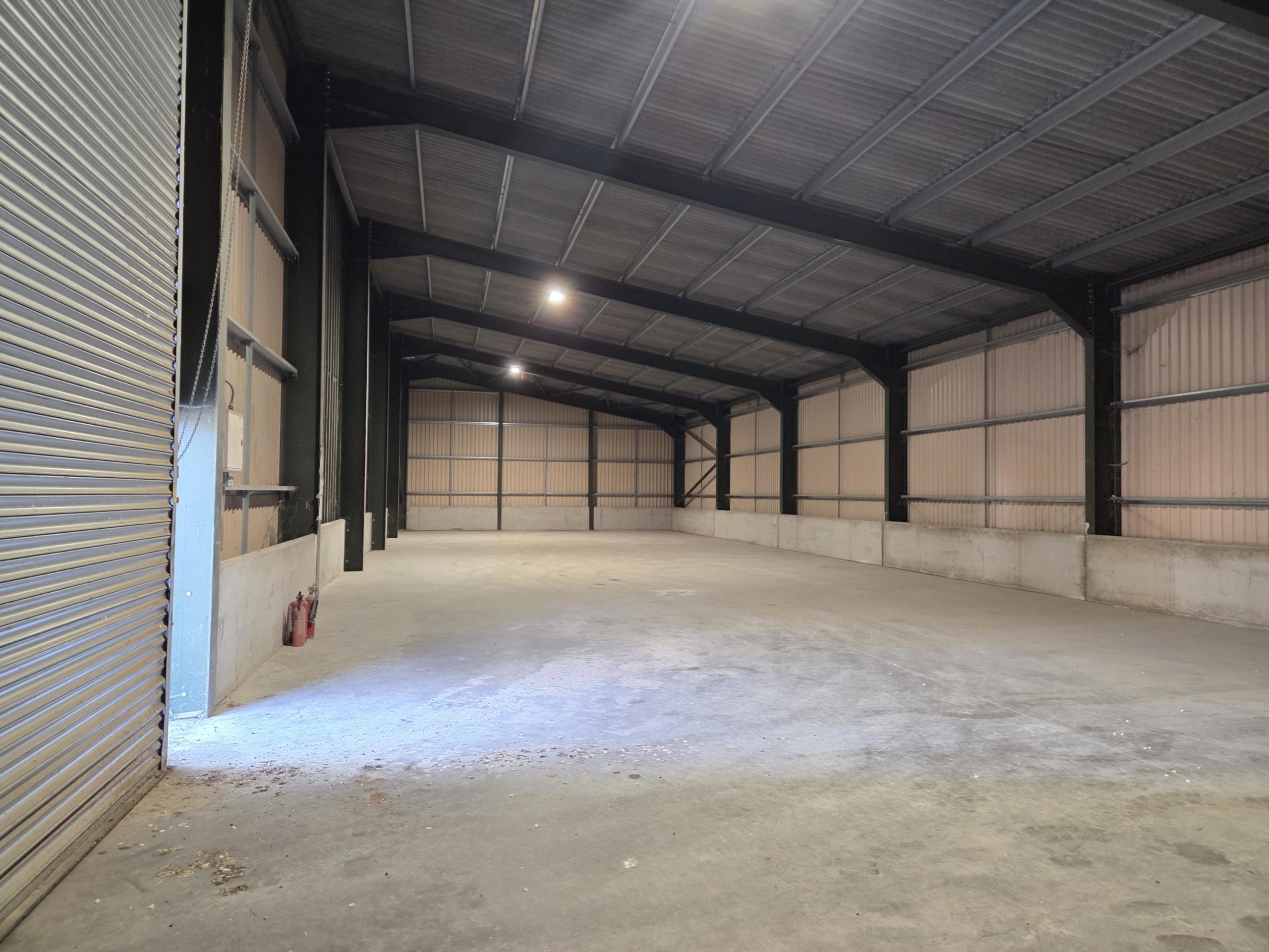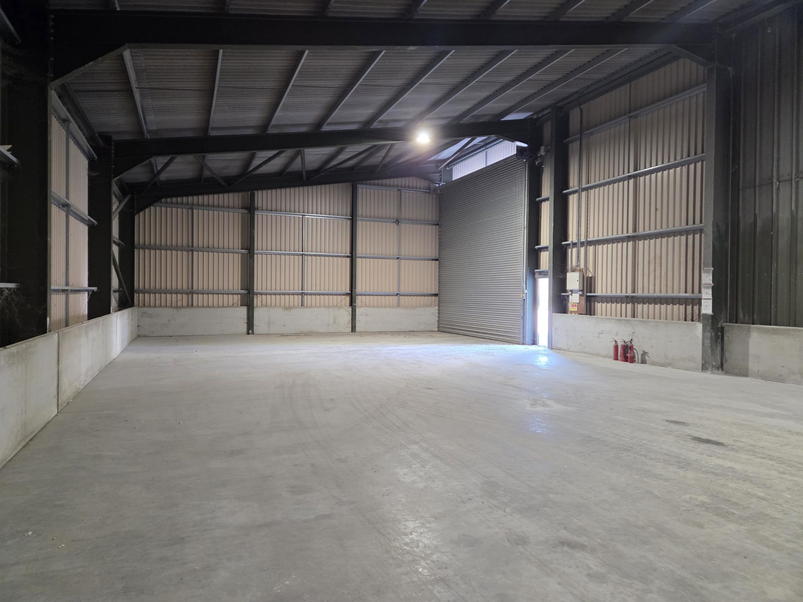 5,000 sq ft warehouse to let on a secure rural site with electric roller-shutter door and a concrete floor.