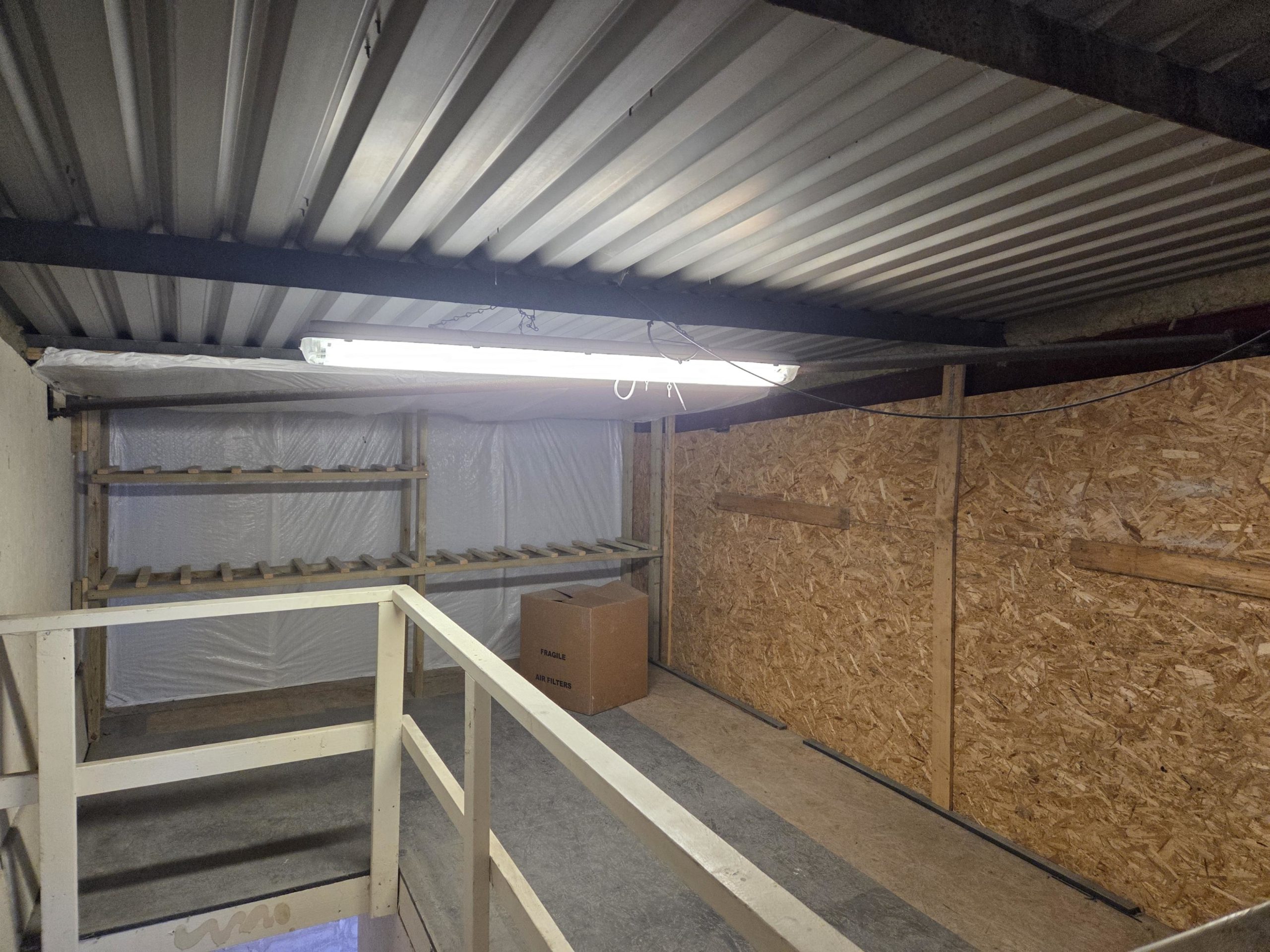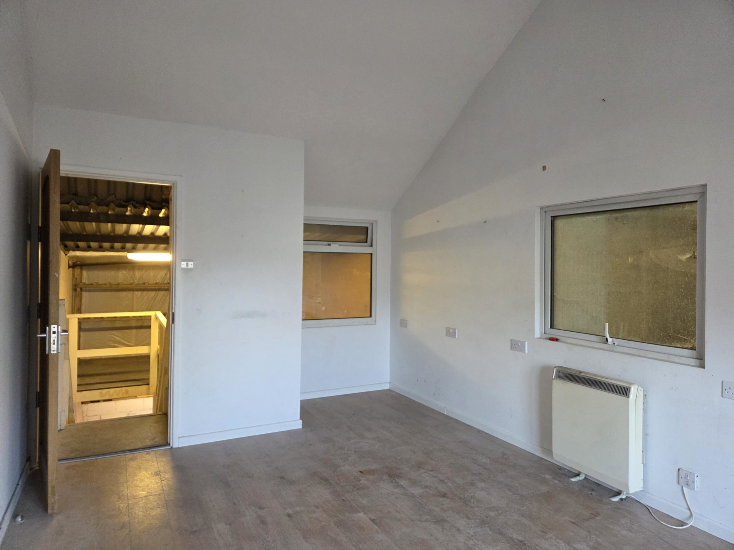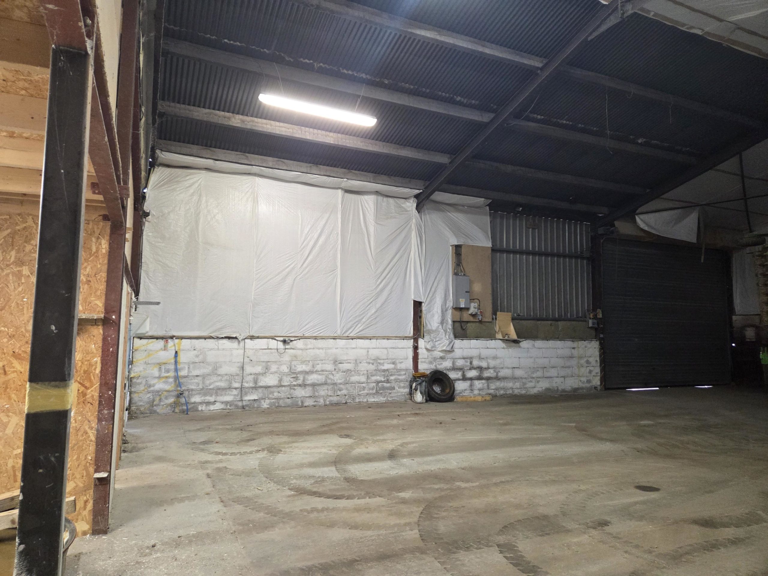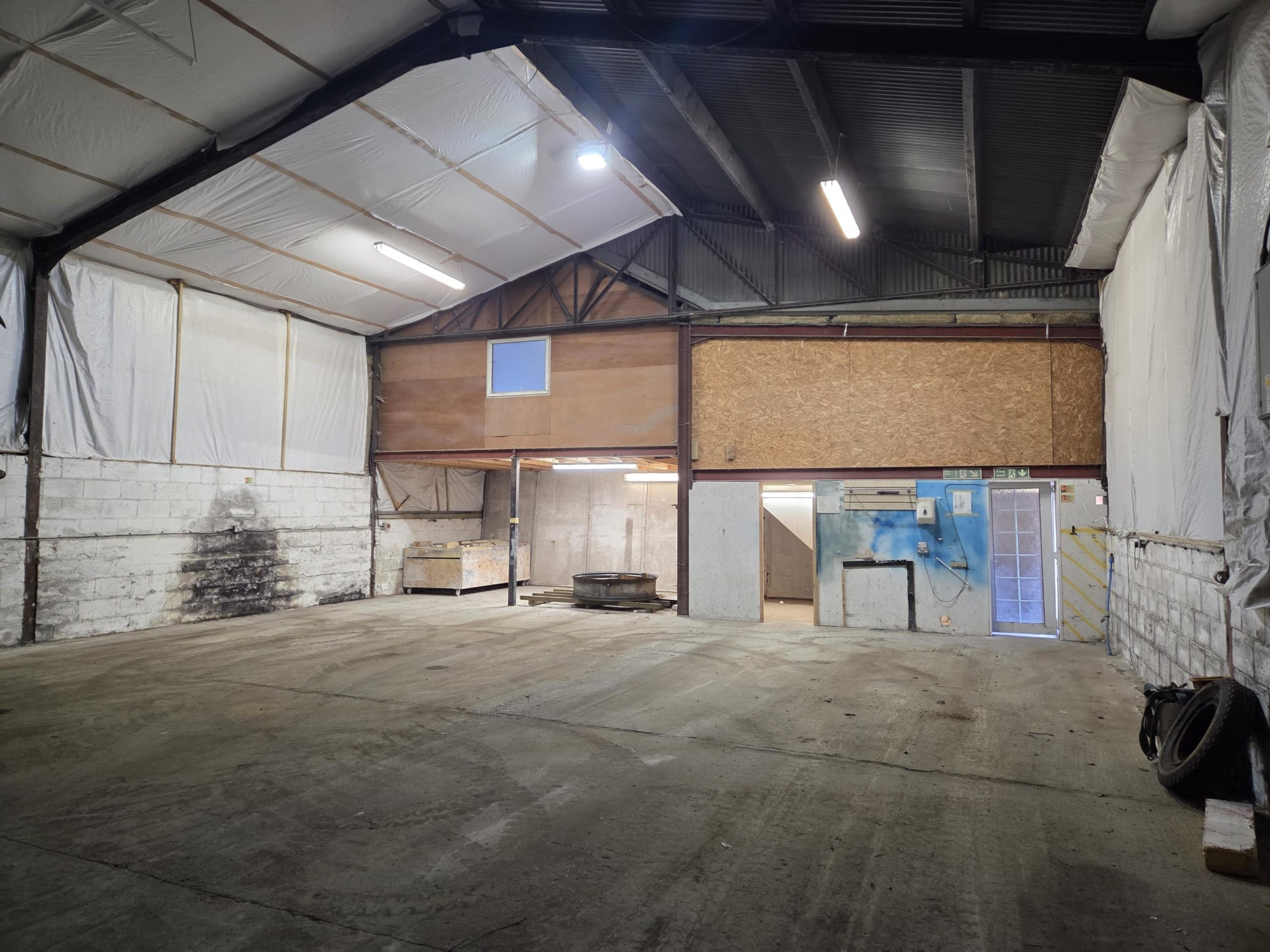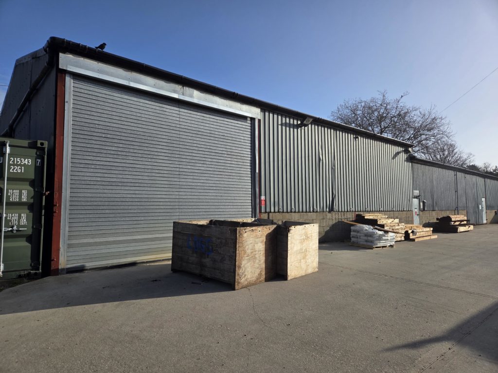 2,700 sq ft warehouse with mezzanine office to let on a secure rural site with electric roller-shutter door and a concrete floor.
