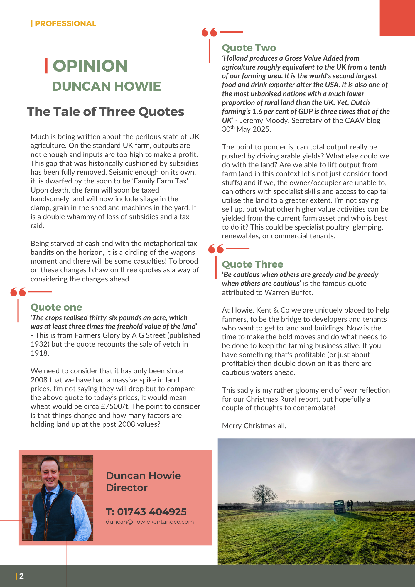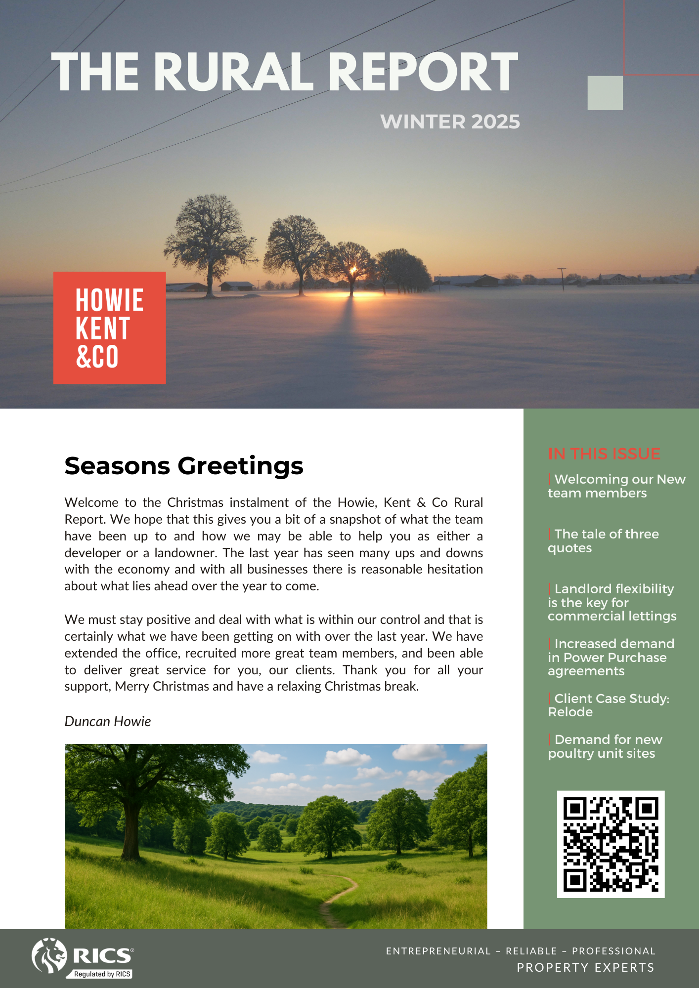 Welcome to the winter instalment of the Howie, Kent & Co Rural Report. We hope that this gives you a snapshot of what the team have been up to and how we may be able to help you as either a developer or a landowner.